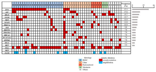 Next, we examined the types of somatic mutation and their frequencies in different histological subtypes (Figure 4). The most frequently mutated gene in HGSC was TP53 (66.7%), which was significantly higher than non-HGSC (p = 0.004), followed by EGFR (16.7%) and MET (16.7%). In clear cell carcinoma, APC and DCAF12L1 were mutated preferentially (30.8%), followed by mutations in TP53, PIK3CA, and PDGFRA mutations (23.1%). In endometrioid carcinoma, PIK3CA and SLITRK5 mutations were detected frequently (40%). In mucinous carcinoma, KRAS mutation (p.G12D) were detected in two cases (66.7%).