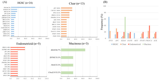 Frequencies of genetic mutation according to histological subtype. Bar graph represented percentage of patients with each mutation. (A) Frequencies of genetic mutations in four histological types, high grade serous (HGSC), clear, endometrioid, and mucinous carcinoma. (B) Frequencies of the top eight genetic mutations (TP53, APC, KRAS, EGFR, MET, NPAP1, PIK3CA, and ALK) according to histological subtype.