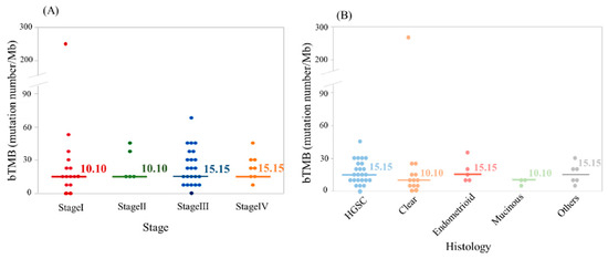 Gandara et al. reported that high bTMB (≧16 Mb) was clinically responsive to anti-PD-L1 therapy in non-small cell lung cancer [50]. This study suggested the association of bTMB and clinical outcomes in ovarian cancer for the first time. We reported previously that bTMB might be a new biomarker for monitoring treatment during NAC in advanced ovarian cancers [28], but the mechanism of the association of bTMB with efficacy of chemotherapy nor immunotherapy remains unclear in ovarian cancer. In our current analysis of bTMB among all the clinical stages and different histological subtypes, although there were no significant differences in the pre-treatment baseline bTMB in each group, or bTMB association with PFS, we could detect some populations of highly mutated tumors in each group (Figure 5), which might be the therapeutic target for anti-PD-L1/PD-1 therapies [50]. Further experiments are needed to evaluate whether bTMB might serve as a non-invasive alternative biomarker for clinical benefit to ovarian cancer patients, especially in terms of advanced stage.