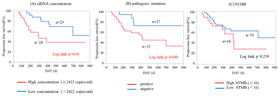 Kaplan–Meier analysis of progression-free survival patients in all ovarian cancer patients (n = 49). (A) Patients with higher cfDNA concentration had significantly worse progression-free survival (PFS; p = 0.01 by log-rank test). (B) Patients with one or more pathogenic mutations had significantly worse PFS (p = 0.048 by log-rank test). (C) bTMB level was not significantly associated with PFS (p = 0.250).
