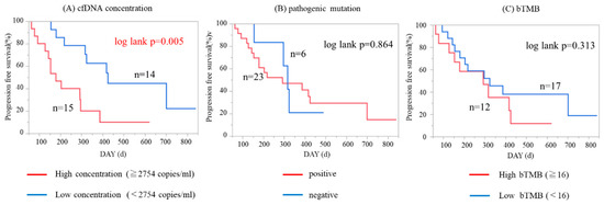 Kaplan–Meier analysis of progression-free survival (PFS) patients in stage III–IV ovarian cancer patients (n = 29). (A) Patients with higher cfDNA concentration had significantly worse PFS (p = 0.005 by log-rank test). (B) Presence/absence of pathogenic mutation did not significantly associate with PFS (p = 0.864). (C) bTMB level was not significantly associated with PFS (p = 0.313).