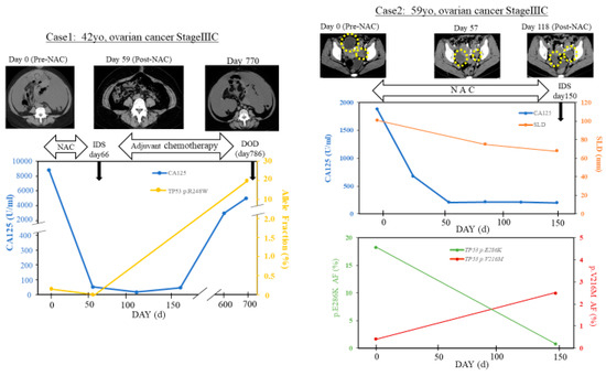 Monitoring ctDNA in neoadjuvant chemotherapy (NAC)-treated ovarian cancer patients. The figures showed the time course of allele frequency of ctDNA, serum CA125 level, and sum of the longest diameters (SLD; only in case 2) with their clinical events and treatments as well as changes in computed tomography (CT) images. In case 1, TP53 R248W level in ctDNA (yellow line) was not detected after NAC alongside response to treatment. The allele fraction of TP53 R248W in ctDNA increased during the serum CA125 level (blue line) along with progressive disease. In case 2, two site mutations of TP53 (p.E286K, V216M) were detected before NAC. The patient responded initially to NAC, but SLD of the tumor (orange) and the serum CA125 level (blue) remained stable. After five cycles of NAC, the allele fraction of TP53 p.E286K (green line) decreased, while the allele fraction of TP53 p.V216M (red line) increased. SLD: sum of the longest diameters.