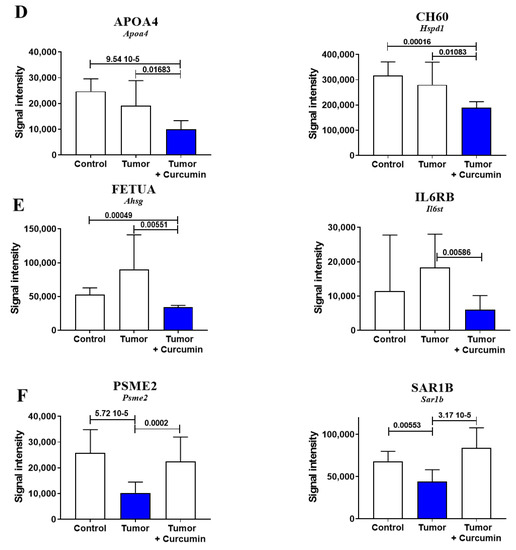 The following are available online at https://www.mdpi.com/2072-6694/12/11/3384/s1, Figure S1: NMR spectra of the batch of curcumin used to treat the G3 group of rats, Figure S2–S4: Correlation plots between biomarkers identified in Section 2.2, Section 2.3 and Section 2.4, Table S1: Full names of the proteins, listing the 61 biomarkers of interest showing decreased abundance in G2 vs. G1 and G3 vs. G2 but not in G3 vs. G1, Table S2: Full names of the proteins, listing the 118 biomarkers of interest showing increased abundance in G2 vs. G1 and G3 vs. G2 but not in G3 vs. G1, Table S3: Changes in liver protein abundances within the G2 group (Advanced vs Initial stages of M5-T1 tumor development).