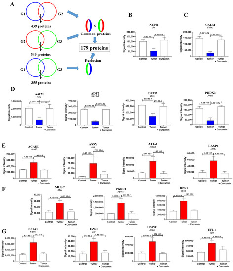 Liver biomarkers exhibiting the most dramatic quantitative changes under metastatic colonization by M5-T1 cells. (A) Diagram of the method used to identify the 179 biomarkers of interest. G1 = group of normal rats, G2 = group of untreated rats, G3 = group of curcumin-treated rats. (B–D) Biomarkers exhibiting the most dramatic changes within the 61 proteins presenting a decreased abundance, located in endoplasmic reticulum (B), cytoplasm and cytoskeleton (C), and mitochondria (D). (E–G) Biomarkers exhibiting the most dramatic changes within the 118 proteins presenting an increased abundance, located in mitochondria, cytoplasm or plasma membrane (E), endoplasmic reticulum (F), or present in multiple subcellular compartments (G).