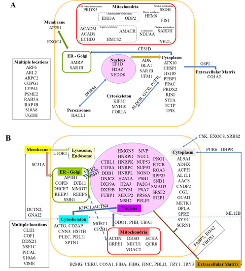 Additional biomarkers of interest showing abundance changes under metastatic colonization. (A) Liver biomarkers exhibiting significant decreased abundance in G2 vs. G1 and G3 vs. G2 but not in G3 vs. G1. (B) Liver biomarkers exhibiting significant increased abundance in G2 vs. G1 and G3 vs. G2 but not in G3 vs. G1. Each protein of interest is represented by its abbreviation and location (according to Uniprot.org). For proteins located in several subcellular compartments or extracellular matrixes, links between these are represented by arrows. The full names and equivalent human genes that encode the corresponding proteins are provided in Tables S1 and S2.