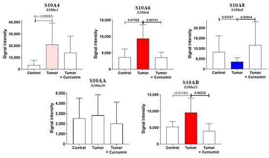 We previously demonstrated that S10A4, a member of the S100 family of calcium-binding and proinflammatory proteins [32], represented a crucial biomarker of tumor invasiveness and host organ colonization by M5-T1 cells [15], a protein of equal interest for studies on osteosarcomas [33,34]. In this study, the combined increase in S10A6 and S10AB in untreated rats and return to normal values following curcumin treatment are consistent with previous findings that, among eight proteins belonging to this family, these two showed the most dramatic increase in tumor vs. normal tissues [35]. The differential pattern of changes observed in S10A4 relative to S10A6 could be explained by the immune response specifically observed in curcumin-treated rats as S10A4, in contrast to S10A6, is highly expressed in immune cells [36]. The absence of further difference in abundance of S10A6 in treated vs. normal rats also tends to confirm the impact of curcumin treatment on cancer cell motility given the involvement of S10A6 on cytoskeletal organization [37]. The return to normal values of S10AB under treatment is also consistent with our previous finding of a dramatic increase in this protein’s abundance specifically observed in neoplastic vs. preneoplastic rat mesothelial cells [15]. The comparable S10AB values observed in curcumin-treated and normal rats lead to the conclusion that the activation of different signaling pathways, which were associated with S10AB increases in different types of cancer [38,39,40,41], was cancelled under treatment. Finally, we found the same opposite evolution of S10A4 and S10A8 as that observed in oral squamous cell carcinomas, suggesting that combinatorial analysis of these two S100 proteins would predict the lesions’ degree of malignancy [42].