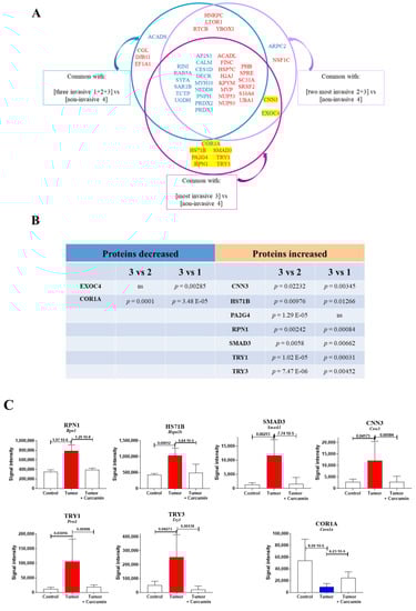 To identify biomarkers common to liver colonization by tumor cells and the M5-T1 tumor, the list of 439 proteins identified in G2 vs. G1 was cross-compared with three lists of proteins showing significant log2-fold changes in protein content in (1) all invasive tumors [1 = F4-T2, 2 = F5-T1, and 3 = M5-T1] vs. the noninvasive [4 = M5-T2], (2) the two more invasive tumors [2 = F5-T1 and 3 = M5-T1] vs. the noninvasive [4 = M5-T2], and (3) the most invasive tumor [3 = M5-T1] vs. the noninvasive [4 = M5-T2]. The procedure used to establish these lists was described in a previous study [15]. The proteins shared by each condition are illustrated in Figure 6A. In total, seven proteins were specifically found to be common to the M5-T1 tumor: coronin-1A (COR1A, encoded by Coro1a), heat shock cognate 70-kDa protein 1b (HS71B, encoded by Hspa1b), proliferation-associated protein 2G4 (PA2G4, encoded by Pa2g4), subunit 1 of dolichyl-diphosphooligosaccharide-protein glycosyltransferase (RPN1, encoded by Rpn1), homolog 3 of mothers against decapentaplegic (SMAD3, encoded by Smad3), anionic trypsin-1 (TRY1, encoded by Prss1), and cationic trypsin-3 (TRY3, encoded by Try3). Two additional proteins involved in abundance changes and found to be common to the two most invasive tumors, M5-T1 and F5-T1, were also considered, exocyst complex component 4 (EXOC4, encoded by Exoc4) and calponin-3 (CNN3, encoded by Cnn3). Two additional MarkerView statistical analyses between M5-T1 vs. F5-T1 (3 vs. 2) and M5-T1 vs. F4-T2 (3 vs. 1) finally reduced the number to seven (Figure 6C), as proteins showing no significant differences (p > 0.05) in either situation were excluded from the list (Figure 6B). In addition to the biomarkers specifically shared by the M5-T1 tumor, a large number of proteins were also found to be common to liver colonization by M5-T1 cells and to the invasive nature of the three tumors (Figure 6A).