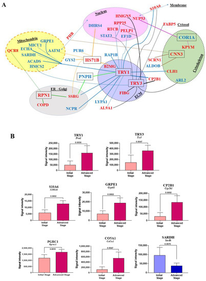 As important differences were observed for some biomarkers in correlation plots illustrating changes in abundances within the eight rats composing the G2 group (“Tumor”), we next wondered if they could be related to the stage of tumor development defined in Figure 1B,C (advanced vs. initial stage), represented each by four rats. Analysis of the seven biomarkers common to the liver colonization by M5-T1 tumor cells and the most invasive tumor (see Section 2.5 and Figure 6) first revealed that only TRY1 and TRY3 exhibited significant differences between the two stages (Figure 7B). Secondly, the analysis of all other biomarkers identified in Section 2.2, Section 2.3 and Section 2.4 and illustrated in Figure 2, Figure 3, Figure 4 and Figure 5 showed that, as for trypsinogens, abundance decrease and increase were enhanced with tumor progression for three (ACADS, CHSP1, SARDH) and 16 additional proteins (ADHX, AL1L1, CO5A1, CP2B1, DNJC8, DX39A, FETUA, FIBG, GRPE1, IRGM, MMGT1, PDLI1, PELP1, PGRC1, RTCB, S10A6), respectively. Figure 7B illustrates the proteins concerned with the most significant differences (p values < 0.01) and Table S3 describes all other cases (for 0.01 < p < 0.05). For 17 other proteins (AP2S1, ARL2, DJB11, ECHA, FABP5, FINC, H2AJ, HMCS2, HNRPK, IDH3A, LYPA1, NCPR, PA2G4, PICAL, PPAC, SRSF2, VIME), change in abundance did not followed tumor progression (Table S3).
