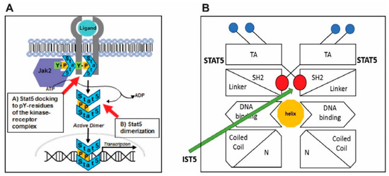 Activation of Stat5 occurs through inducible phosphorylation of a conserved C-terminal tyrosine residue. Activation of Stat5 is a two-step process: First, the Stat5 monomer docks transiently to a phospho-tyrosyl moiety of the tyrosine kinase-receptor complex, which results in the phosphorylation of the Y694/699 residue of Stat5a and Stat5b, respectively, by a tyrosine kinase (Figure 1A) [41,42,43,44,45,46]. Docking of Stat5 to the receptor-tyrosine kinase complex is mediated by the SH2-domain of Stat5 and is required for Stat5 phosphorylation [36,38,41] (Figure 1A,B). Therefore, disruption of the SH2-domain-mediated docking of Stat5 to the receptor-tyrosine kinase complex leads to suppression of Stat5 phosphorylation and activation. Second, the SH2-domain of a phosphorylated Stat5 monomer binds the phosphorylated Y694/699 residue of the partner Stat5 to form a transcriptionally active parallel dimer, which translocates to the nucleus to regulate transcription [36,38,41] (Figure 1A). In other words, also the dimerization of Stat5 dimerization is mediated by the SH2-domain of Stat5.