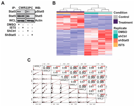 IST5 show high transcriptional specificity in prostate cancer cells. (A), Stat5 was suppressed in CWR22Pc cells by lentiviral expression of shStat5 vs. shCtrl or by treatment with IST5 (6 µM) vs. vehicle for 3 days. Stat5 was immunoprecipitated (IP) and immunoblotted (WB) with anti-pYStat5 mAb and anti-Stat5 mAb. Whole-cell lysates (WCL) were immunoblotted with anti-actin pAb as loading control. (B), A heatmap demonstrating genes regulated by IST5 vs. genetic knockdown of Stat5 compared to their respective controls (vehicle and shCtrl). Red, higher expression; blue, lower expression. Each column represents a sample and each row represents a transcript. For false discovery rate (FDR) <0.01 and fold change >2 or <−2 as cutoff, 324 and 468 transcripts were upregulated, and 765 and 489 transcripts were downregulated in IST5 and shStat5 treated cells. (C), Pearson correlation coefficient ranging from 0.98–0.99 shows a high dependence between the transcriptomes regulated by shStat5 vs. IST5. The distribution histogram of each sample is shown on the diagonal. The bivariate scatter plots with a fitted line are displayed at the bottom and the correlation coefficients are shown on the top of the diagonal. The asterisks indicate the levels of significance associated with the correlations, *** represents the p value < 0.001.