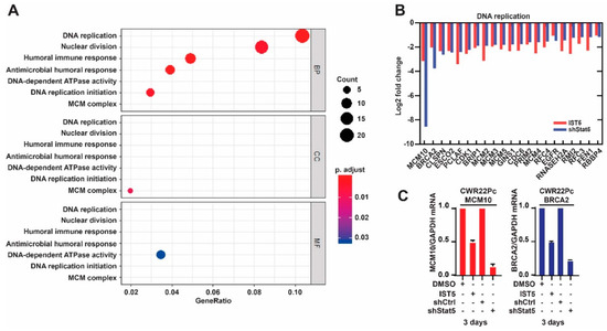Pathway enrichment analysis of genes regulated similarly by IST vs. genetic knockdown of Stat5 in prostate cancer cells. (A), a dot plot of functionally enriched pathways in the genes regulated both by IST5 and genetic knockdown of Stat5 in PC with corresponding adjusted p values is shown. The size of each dot represents the number of transcripts in the corresponding pathway and the color indicates the significance. (B), a key cluster of 21 genes associated with the enriched pathways related to DNA replication which were regulated by both IST5 and genetic knockdown of Stat5 in PC cells. Log2 fold change is shown. (C), mRNA levels of MCM10 and BRCA2 were reduced, determined by quantitative real-time polymerase chain reaction (qRT-PCR), in CWR22Pc cells upon genetic knockdown of Stat5 by lentiviral expression of shStat5 vs. shCtrl or by treatment with IST5 (6 µM) vs. vehicle for 3 days.