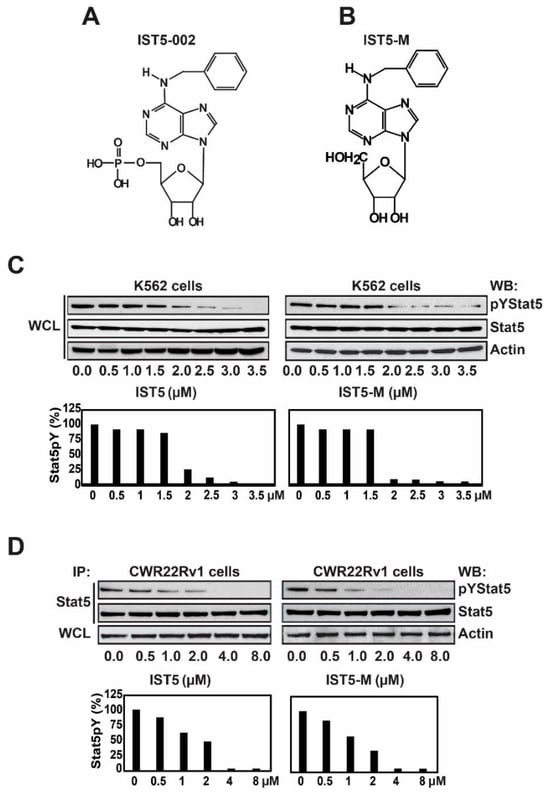 In order to evaluate whether the phosphate group of IST5 is critical for IST5 activity in cell-based assays, we compared the potency of IST5 (Figure 4A) to that of IST5-M (IST5 without the phosphate group) (Figure 4B) in inhibiting phosphorylation of Stat5 in PC and CML cells. CML (K562) cells and PC (CWR22Rv1) cells were cultured for 4 days with increasing concentrations of IST5 and IST5-M (Figure 4C,D). Both IST5 and IST5-M inhibited Stat5 phosphorylation in K562 cells (IC50~1.1 µM) and CWR22Rv1 cells (IC50~1.3 µM) at similar concentrations, where 2 µM of either compound resulted in approximately 75–90% inhibition of Stat5 phosphorylation in K562 cells and 60–75% inhibition in CWR22Rv1 cells. Collectively, these finding indicate that IST5 and IST5-M have similar efficacies in inhibiting phosphorylation of Stat5 in both CML and PC cells.