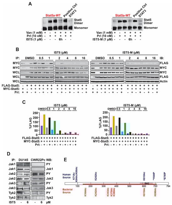 Both IST5 and IST5-M suppress dimerization of Stat5 with similar efficacies in prostate cancer cells. (A), IST5 and IST5-M inhibit equally potently dimerization of Stat5 in native-gel-based Stat5 dimerization assay. CWR22Rv1 cells were transfected with STAT5A-eYFP (Stat5 wild type), STAT5A-N642H-eYFP (constitutive activated Stat5 by N642H mutation, as a positive control) or STAT3-eYFP (Stat3 wild type, as a negative control) constructs for 3 days. CWR22Rv1 cells were serum-starved for 16 h, pretreated with vanadate (1 mM) for 2 h, followed by treatment with vehicle, IST5 and IST5-M (1 µM) for 6 h and stimulation with Prl (10 nM) for 1 h. Dimerization of Stat5 was analyzed by detection of the eYFP fluorescence of the native Coomassie gel. (B), IST5 and IST5-M inhibited cytokine-induced dimerization of Stat5 with high efficacy in PC cells. PC-3 cells were co-transfected with pCMV-3Flag-Stat5a, pCMV-3Myc-Stat5a, and pPrlR plasmids. Cells were serum-starved for 16 h, pretreated with IST5, IST5-M or vehicle at indicated concentrations for 2 h, followed by stimulation with Prl (10 nM) for 30 min. Anti-MYC mAb was utilized to immunoprecipitate the MYC-tagged Stat5a and blotted with anti-FLAG mAb or anti-MYC mAb, as indicated. Whole cell lysates (WCL) were blotted with anti-MYC mAb, anti-FLAG mAb, or anti-actin mAb to demonstrate the input. (C), densitometric analyses of the Stat5 dimerization data based on co-immunoprecipitations and immunoblotting in (B). (D), IST5 did not alter phosphorylation of Jak1, Jak2, Jak3 or Tyk2 in DU145 and CWR22Pc cells. Prostate cancer cells were treated with IST5 (6 µM) or vehicle for 6 h. Jak1, Jak2, Jak3 and Tyk2 were immunoprecipitated and blotted with anti-phospho-tyrosine, Jak1, Jak2, Jak3 and Tyk2 antibodies. Whole cell lysates (WCL) were immunoblotted for actin. (E), differences in posttranslational modifications were detected between native and recombinant STAT5a using mass spectrometry. Native STAT5a from CWR22Rv1 cells and recombinant STAT5a from E. coli were gel-purified, digested using trypsin, and analyzed by bottom-up mass spectrometry. Native full-length STAT5a (blue) is show with recombinant STAT5A highlighted (red). Sites of acetylation and phosphorylation from the respective sources are noted including two previously published sites of phosphorylation (asterisk).