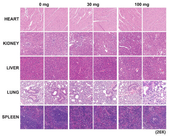 IST5 does show any significant chronic toxicity in vivo in mice. The chronic toxicity studies were carried out in both male and female C57BL/6J and athymic nude mice by daily administration of IST5 vs. vehicle at doses of 0, 10, 30 and 100 mg/kg (n = 5/dose). At the end of the study, heart, kidney, liver, lung and spleen tissues were fixed and stained with hematoxylin and eosin. The gross histology of heart, liver, spleen, kidney, spleen and brain were all normal (28 d).