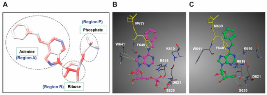 Comparison of the docking of IST5 vs. IST-M to Stat5 in silico. (A) Interaction-based color-coded atoms of our inhibitor IST5 and the three regions for modifications. Hydrogens are not shown. (B) Comparison of docking of IST5 (1 with the 5′-phosphate group) (A) and compound. 2 without 5′-phosphate group (C) to Stat5a.
