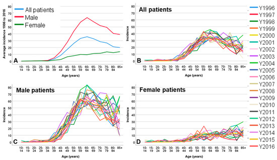 2.2. Epidemiology: Crude Incidences of Patients’ and Tumor Characteristics between 1996 and 2016