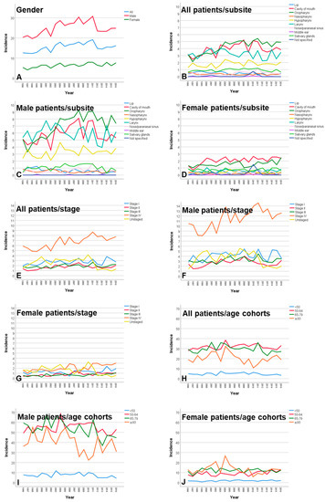 - Mourad, M.; Jetmore, T.; Jategaonkar, A.A.; Moubayed, S.; Moshier, E.; Urken, M.L. Epidemiological Trends of Head and Neck Cancer in the United States: A SEER Population Study. J. Oral Maxillofac. Surg. 2017, 75, 2562–2572. [Google Scholar] [CrossRef]