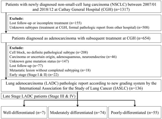 From January 2007 to December 2018, patients with late-stage (stage IIIA, IIIB and IV) LADC who received treatment at Cathay General Hospital (CGH), Taipei, Taiwan were identified. The inclusion criteria for the current study were as follows: (i) patients who received a lung tumor biopsy at CGH (FFPE: formalin-fixed paraffin-embedded tissues obtained through computed tomography (CT)-guided needle biopsy, echo-guided core needle biopsy, or transbronchial biopsy); and (ii) pathological confirmation of LADC using the new grading system []. The exclusion criteria were patients: (i) who were lost to follow-up; (ii) who received incomplete treatment; (iii) who received a formal pathology report from another hospital; (iv) who were diagnosed pathologically through a pleural effusion cell block; (v) for whom no definite pathological subtype was identified; (vi) for whom the carcinoma was of uncertain origin, adenosquamous, or neuroendocrine; and (vii) with unknown gene mutation status. This study was approved by Cathay General Hospital (CGH), Taipei, Taiwan (NO.: CGH-P108001). The informed consent form was waived in this study.