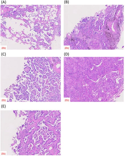 Histological patterns of lung adenocarcinoma. Representative hematoxylin and eosin-stained biopsy specimens: (A) lepidic-predominant pattern; (B) acinar-predominant pattern; (C) papillary-predominant pattern; (D) solid-predominant pattern; and (E) micropapillary-predominant pattern.