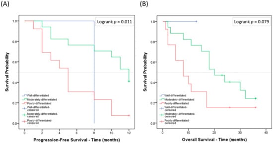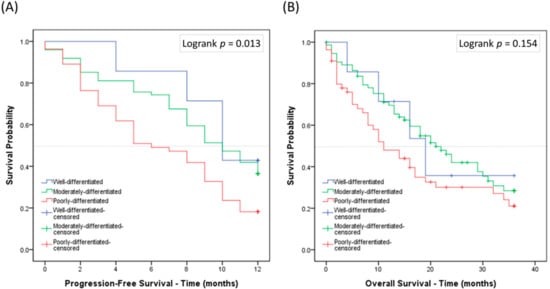 The survival outcomes of the poorly differentiated, moderately differentiated, and well differentiated groups diagnosed between January 2007 and December 2018 were analyzed. Each group had a statistically significant difference in PFS (p = 0.013) but not in OS (p = 0.154) (Figure 3A,B). Those without systemic treatment (n = 27, Table 2) had a predominantly inferior outcome in both PFS (p < 0.001) and OS (p < 0.001) (Figure S2). No difference in PFS or OS was seen between each group (Figure S3). When the survival analysis examined only wild-type EGFR patients, the poorly differentiated group had the worst PFS (p = 0.011) when treated with chemotherapy (Figure 4A,B). This was not observed in those with EGFR mutations when treated with TKIs (Figure S1A,B).