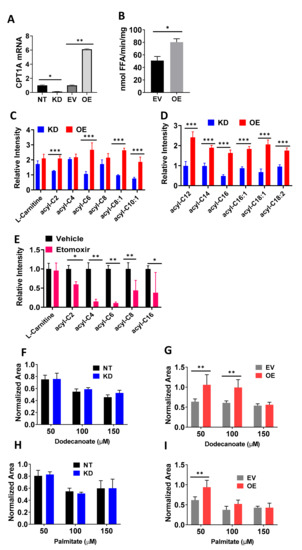 - Schlaepfer, I.R.; Joshi, M. CPT1A-mediated fat oxidation, mechanisms, and therapeutic potential. Endocrinology 2020, 161, 161. [Google Scholar] [CrossRef]