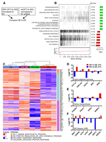 To identify the molecular signatures associated with CPT1A expression, we performed RNAseq in the C4-2 KD and OE cells. Figure 2 and Table S1 show the results of our analysis comparing the OE cells to the KD cells. Briefly, we normalized each cell line to its respective control (Figure 2A), and then we used limma to compare the gene expression differences between OE and KD [29]. Overall, we found 1157 genes upregulated and 1385 genes downregulated when comparing the OE cells to the KD cells. Genes were filtered by an adjusted p-value of 0.0001. Using gene set enrichment analysis (GSEA), we found that ER stress and UPR response were some of the most significant pathways increased in the OE cells, pointing to possible lipid-mediated oxidative stress (Figure 2B). Cell division, mitosis and E2F targets pathways were significantly decreased in OE cells, which is in agreement with their decreased growth rate compared to their control line [10]. The androgen response hallmark gene set was significantly decreased in the OE cells and it reflects less dependency of OE cells on AR signaling, which is something we have observed and reported previously [10]. As expected from our metabolic observations, the lipid catabolic process pathway, including the CPT1A gene, was significantly increased in OE cells compared to KD cells. Figure 2C shows a heatmap of genes from the leading-edge analysis in Figure 2B associated with lipid catabolism, response to cellular stress and androgen response pathways. Enrichment plots for these pathways are shown in Figure S2. Examination of the significant genes in these pathways (Figure 2D–F), showed opposite directions of change between OE and KD cells. For most of the genes, the KD cells showed decreases in gene expression when compared to OE cells.