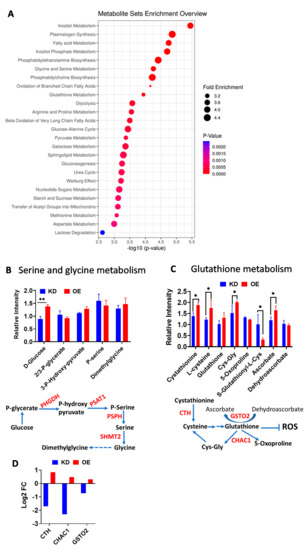 Excess CPT1A is associated with serine and glycine metabolism pathway and glutathione homeostasis metabolites. (A) Metabolite set enrichment analysis of OE metabolites versus KD cell metabolites after normalization to their own controls. The p-value is defined by the color scale, and the enrichment by the size of the circle. (B) Relative abundance of metabolites associated with the serine and glycine biosynthesis via the SHMT2 gene in the mitochondria. A scheme of the pathway is shown under the graphs, highlighting the sequence of events from glucose to synthesis of serine, glycine and the one carbon metabolism compound dimethylglycine. The genes significantly altered in OE cells from the RNAseq analysis involved in the pathway are shown in red. (C) Relative abundance of metabolites associated glutathione (GSH) homeostasis. The S-glutathionyl-L-Cys metabolite is associated with ineffective handling of oxidative stress. A scheme to the pathway is shown below. * p < 0.05, ** p < 0.01. (D) Gene expression analysis of OE versus KD cells for CTH (p = 6.29 × 10−13), CHAC1 (p = 3.6 × 10−12) and GSTO2 (p = 0.003) genes (adj p-value).