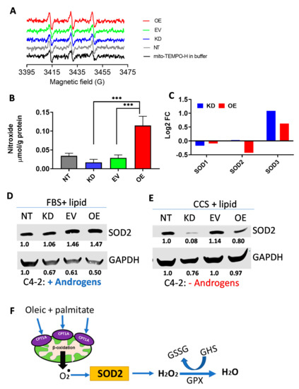 Mitochondrial reactive oxygen species (ROS) are increased in CPT1A-OE cells. (A) Electron paramagnetic resonance spectroscopy (EPR) traces of the four cell lines tested, including the mitochondrial probe by itself. Amplitude and linewidth provide information of the amount of ROS. The concentration was acquired by Spin Fit followed by SpinCount module (Bruker). (B) Quantification of the EPR traces normalized to protein content. *** p < 0.001. (C) Gene expression analysis of OE versus KD cells for SOD1 ns), SOD2 (p = 6.9 × 10−4), and SOD3 (p = 0.015). Only SOD2 is a mitochondrial enzyme. (D,E) Western blots of SOD2 expression after incubation with fatty acids (Oleic and palmitate mixture; 25 µM each) in FBS (D) or charcoal stripped serum (CSS) (E) for 48 h. (F) Schematic of the role of SOD2 in metabolizing superoxide and the role of glutathione in eliminating H2O2. GPX = Glutathione peroxide. GSSG = oxidized glutathione.