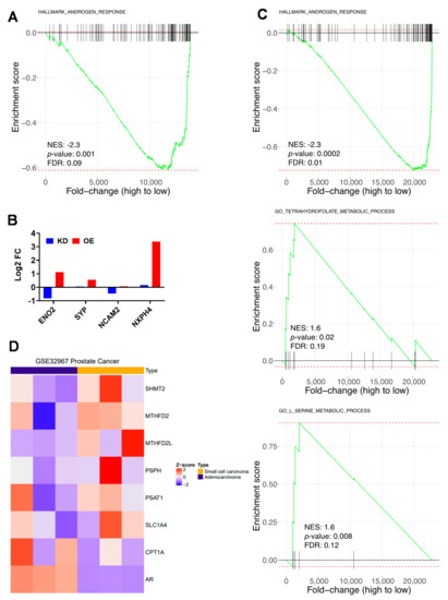 Lipid and serine metabolism genes are associated with less androgen signaling and a neuroendocrine phenotype. (A) Gene set enrichment analysis (GSEA) plot of the OE versus KD analysis showing the decrease in the androgen response hallmark in OE cells. (B) Gene expression analysis of OE versus KD cells for neuronal-like markers like ENO2 (p = 6.1 × 10−10), SYP (p = ns), NCAM2 (p = 4.14 × 10−5), NXPH4 (p = 1.6 × 10−17). (C) GSEA plots of the public GSE32967 dataset showing the comparison between small cell carcinoma (n = 3) versus adenocarcinoma (n = 3) patient xenografts for the Hallmark Androgen Response; GO_Serine and GO_Tetrahydrofolate pathways. Normalized enrichment scores (NES) and statistical significance are indicated in the plots. (D) Heatmap of the leading-edge genes from the serine and tetrahydrofolate functional GSEA plots shown in panel C, which are also genes increased in the OE cells compared to KD cells. CPT1A and AR are also included and show an inverse correlation in one of the samples of each subtype of PCa studied.