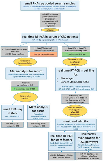 We have investigated the expression pattern of miR-486-5p in CRC on three different matrices, serum, stool, and tissue, finding in CRC patients an up-regulation of this miRNA in the first two matrices and a down-regulation in the third, in respect to controls. Then, we examined miR-486-5p role in the occurrence of the CSC phenotype in CRC cells, through in vitro mechanistic and genomic studies. We also observed a marked down-regulation of miR-486-5p in the sera of patients with metastatic cancer, suggesting the involvement of miR-486-5p in the inhibition of metastasis. This hypothesis is supported by our genomic data, which indicated a role for miR-486-5p in the biology of CSCs by negatively regulating the expression of stemness factors and the main pathways of CSCs: Wnt, Notch, Hedgehog, and TGF-β. In conclusion, our preliminary data could provide a step forward in the understanding of the biomolecular mechanisms of miR-486-5p in CRC and to suggest further investigation to evaluate it as possible prognostic and diagnostic biomarker.