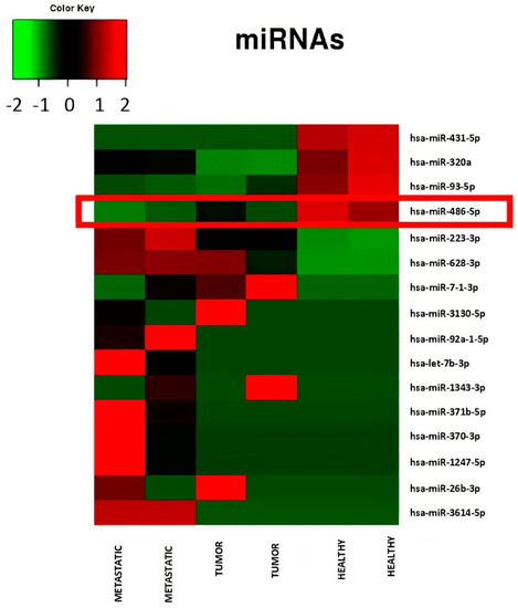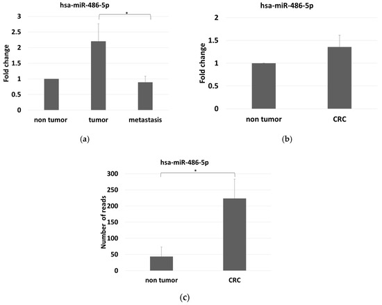 We found that miR-486-5p was overexpressed in the stools of the CRC patients compared with controls. The average number of reads were 43.65 in the controls and 223.67 in the CRC patients, with log2 FC = 2.36 and adjusted p = 3.6 × 10−11 (Figure 3c).