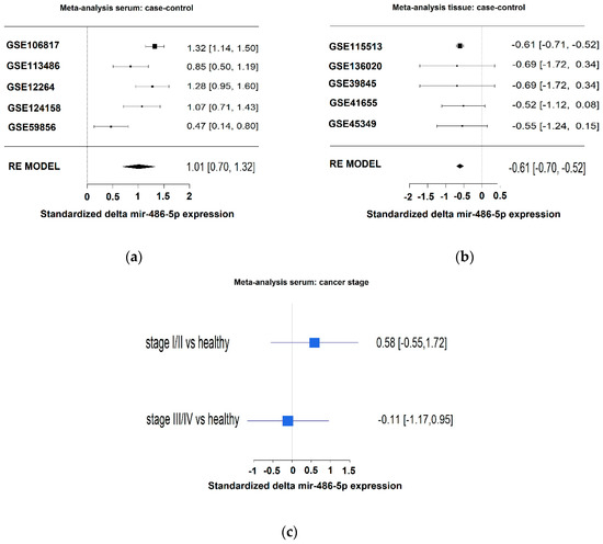 (a) Meta-analysis of miR-486-5p levels in serum by the use of five datasets. Higher levels of miR-486-5p were observed in the case groups; (b) meta-analysis of miR-486-5p levels in tissues by the use of five datasets. Lower levels of miR-486-5p were observed in the case group; (c) expression levels of miR-486-5p related to stage in GSE39845 dataset from the GEO Database. The patients were divided in two groups: low stage (stage I and II) and advanced stage (stage III and IV).