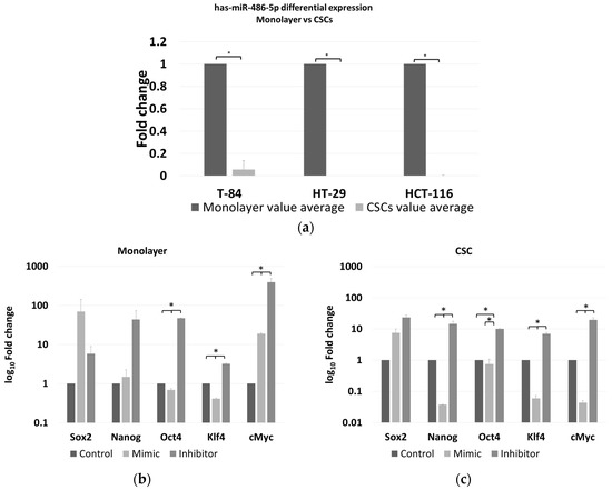 The expression of miR-486-5p was evaluated in an in vitro model able to distinguish its relationship with cancer, in both stem and non-stem cells. The Ct values for miR-486-5p in the CSC and monolayer models of HCT-116, HT-29 and T-84 cell lines were obtained. Then, the FC values between CSCs and the respective monolayers for each cell line were calculated. The levels of miR-486-5p were markedly lower in the three CSC models than in the corresponding monolayers (Figure 5a).