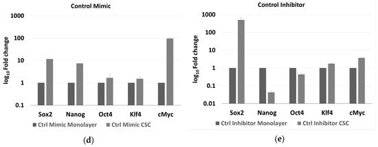 The expression of five stemness genes, SOX2, NANOG, OCT4, KLF4, and cMYC, was evaluated in HCT-116 CSCs and monolayer cells, under the effect of either the miR-486-5p mimic or inhibitor and normalised to the respective controls. We focused our attention on the HCT-116 cell line because, it has been shown as a better model to induce the CSC phenotype, compared to HT-29 which have a greater tendency to differentiate more fast and precisely in vitro than HCT-116 [27], whereas T-84 cell line is a CRC in vitro model derived from lung metastasis. In the HCT-116 monolayers, the expression levels of OCT4 and KLF4 were higher in the controls than in the mimic-treated cells, whereas the expression of all the genes was higher in the inhibitor-treated cells than in either the controls or the mimic-treated cells with exception of SOX2, which was slightly more expressed in the mimic-treated cells, although with not statistical significance. The expression levels of OCT4, KLF4, and cMYC were significantly different between cells in all treatment comparisons (Figure 5b and Table S1A of the Supplementary Material). In the HCT-116 CSCs, the expression of all the stem factors was higher in all the controls than in the mimic-treated cells, with the exception of SOX2, whereas the expression of all the genes was higher in the inhibitor-treated cells than in the control and mimic-treated cells. The differences in all the comparisons were statistically significant, except for the difference in OCT4 among the control and mimic-treated cells (Figure 5c and Table S1B of the Supplementary Material). Comparing the effect of control mimic on stem cell genes in monolayers and CSCs, it shows overexpression of stem cell genes in CSCs, as expected (Figure 5d); the same effect was evaluated for the counter inhibitor, in this case an upregulation is observed for most of the factors except for Nanog and Oct4 (Figure 5e).