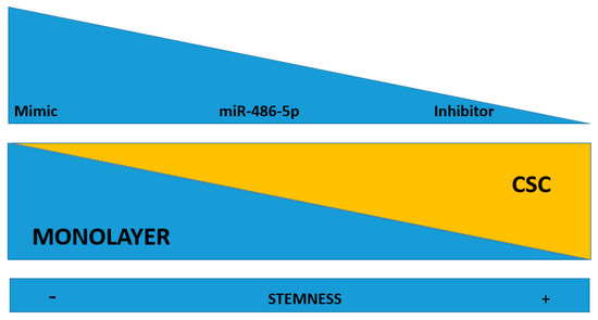 Working hypothesis: miR-486-5p may play an inhibitory effect on the stemness of CSCs. When it is up-regulated by mimic, there is an induction of stemness loss. When the miRNA is down-regulated (by an inhibitor), it induces stemness in the recipient cells. miR-486-5p inhibition drives to CSC phenotype, while its promotion inhibits the CSC phenotype.