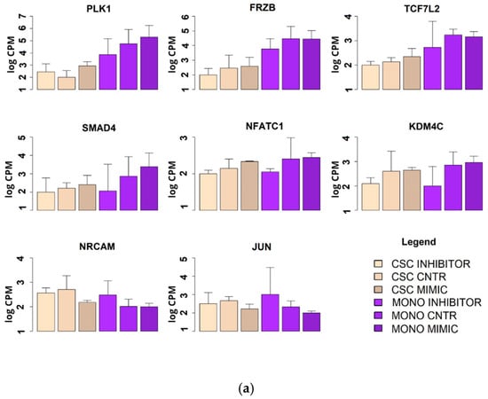 From our results, we conceived a working hypothesis: miR-486-5p exerts a negative regulatory effect on the CSC phenotype in CRC through the activation of genes that inhibit the CSC phenotype and through the down-regulation of genes that promote the CSC phenotype. To test this working hypothesis (depicted in Figure 6), we used mRNA microarrays to analyse the effects of the induced up- or down-regulation of miR-486-5p on HCT-116 cells, in both monolayer cells and CSCs (described in Section 4.10). This approach allowed us to observe if some of these genes suffered the same effect in the two cell types and if they were progressively inhibited or promoted in the passage from the monolayer and CSC phenotype. We tested 135,750 transcripts, among which 2575 showed expression patterns consistent with our working hypothesis (empirical p < 0.05 after permutation-based correction for multiple testing). These genes were then filtered to a list of 240 genes with crucial roles in the CSC phenotype, derived from the four principal biological pathways involved in CSCs: Wnt, Notch, Hedgehog, and TGF-β. Among these genes, 16 were consistent with our working hypothesis. The weighted Kolmogorov–Smirnov enrichment test indicated that genes adherent to our working hypothesis are enriched in the four biological pathways previously described (empirical p < 0.01). These results indicate that miR-486-5p regulate the expression of important genes pertaining to CSC-related pathways. miR-486-5p promotes the expression of 11 genes (PLK1, FRZB, TCF7L2, SMAD4, NFATC1, KDM4C, PPARD, KLF4, CDX2, STAT3, and EP300), which were up-regulated when miR-486-5p was overexpressed and down-regulated when it was inhibited. On the other hand, miR-486-5p inhibits the expression of 5 genes (NRCAM, JUN, WNT10A, FZD8, and NODAL) which were down-regulated when miR-486-5p was overexpressed and up-regulated when it was inhibited. All these genes showed the same behavior in monolayer cells and CSCs, when analysed independently. Eight of these genes showed progressive up or down-regulation in the transition from monolayer cells to CSCs with ptrend < 0.05: PLK1 (ptrend = 0.0001), FRZB (ptrend = 0.0002), TCF7L2 (ptrend = 0.0004), SMAD4 (ptrend = 0.016), NFATC1 (ptrend = 0.02), KDM4C (ptrend = 0.04), NRCAM (ptrend = 0.008), and JUN (ptrend = 0.04). The other eight genes showed no progressive up- or down-regulation in the transition from the monolayer to the CSC phenotype, then the p values were calculated for each condition: PPARD (monolayer ptrend = 0.09; CSCs ptrend = 0.01), KLF4 (monolayer ptrend = 0.09; CSCs ptrend = 0.03), CDX2 (monolayer ptrend = 0.02; CSCs ptrend = 0.06), STAT3 (monolayer ptrend = 0.08; CSC ptrend = 0.01), EP300 (monolayer ptrend = 0.09; CSCs ptrend = 0.03), WNT10A (monolayer ptrend = 0.06; CSCs ptrend = 0.02), FZD8 (monolayer ptrend = 0.09; CSCs ptrend = 0.05), and NODAL (monolayer ptrend = 0.01; CSCs ptrend = 0.03) (Figure 7).