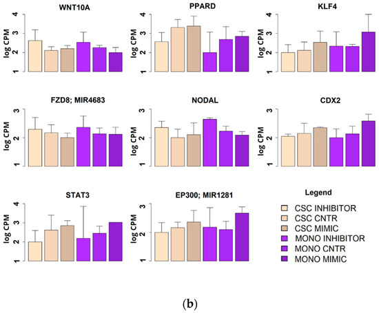 Expression levels of the genes involved in the four main regulatory pathways of the CSC phenotype (Wnt, Hedgehog, Notch and TGFβ) as measured by microarray. Expression levels were measured in two models of HCT-116: CSC and monolayer after treatment with has-miR-486-5p mimic or inhibitor. (a) Statistically significant genes with a progressive increment or decrement in the passage from monolayer to CSCs; (b) statistically significant genes with the same behavior between monolayer and CSCs.