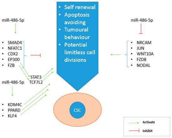 The CSCs phenotype is regulated by four principal pathways: Wnt, Notch, Hedgehog, and TGF-β [6]. Our microarray analyses data highlighted the involvement of miR-486-5p in CRC biology and in the molecular mechanisms of CSCs by regulating the above-mentioned pathways. miR-486-5p promotes the expression of five genes with oncosuppressive role and thereby with a negative effect on the CSC phenotype: FZB [56,57], SMAD4 [58,59], NFATC1 [60,61], CDX2 [62,63] and EP300 [64,65]. On the other hand it inhibits the expression of further five genes with oncogenic and CSC-promoting roles: NRCAM [66,67], JUN [68,69], WNT10A [70,71], FZD8 [72,73], and NODAL [74,75]. Furthermore, miR-486-5p showed a positive effect on the expression of PLK1, involved with a proper cell division process [76] and with controversial behavior in cancer, in which it is described both as an oncogene [77] and an oncosuppressor [78]. Finally, miR-486-5p also promote the expression of five genes with promoting cancer roles: KDM4C [79,80], PPARD [81,82], KLF4 [43], STAT3 [22,40], and TCF7l2 [83,84]. The up-regulation of STAT3 and TCF7l2 in the presence of this miRNA may be a consequence of the miR-486-5p-mediated activation of EP300 [63] and FZB [85] (Figure 8).