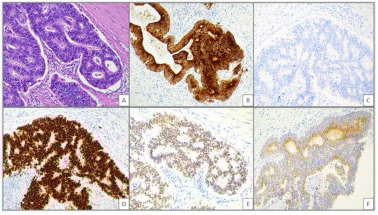 - Zhang, M.Q.; Lin, F.; Hui, P.; Chen, Z.M.; Ritter, J.H.; Wang, H.L. Expression of mucins, SIMA, villin, and CDX2 in small-intestinal adenocarcinoma. Am. J. Clin. Pathol. 2007, 128, 808–816. [Google Scholar] [CrossRef] [PubMed]