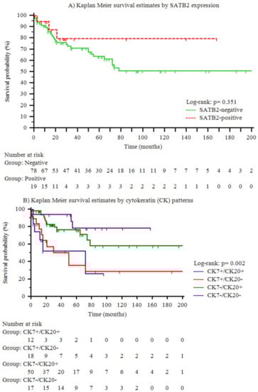 Kaplan–Meier cancer-specific survival estimates by special AT-rich sequence-binding protein 2 (SATB2) expression (A) and cytokeratin (CK) patterns (B).