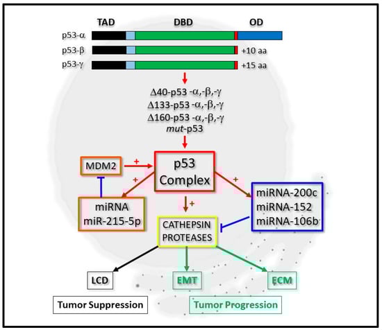 Integrative regulation of cathepsin proteases by p53 and micro-RNA expression. P53-alpha (p53-α) can be expressed as p53-beta (p53-β) or p53-gamma (p53-γ) isoform proteins, which lack the oligomerization domain (OD). Derivatives of these, which lack the complete Transactivation domain (TAD), but retain the DNA-binding domain (DBD), can also be expressed as Δ40-p53, Δ133-p53, Δ160-p53 or mut-p53 forms. The p53 complex can be regulated by micro-RNA (miRNA) expression through a positive feedback loop by positively regulating miRNA-215-5p, which negatively regulates MDM2 protein levels (orange boxes). It can transcriptionally regulate cathepsin protease expression directly or indirectly through directly regulating the expression of miRNA-200c, for example (blue box). Cathepsin protease expression (yellow box) contributes to lysosomal-mediated cell death (LCD) as a tumor suppressor (black boxes) or cell differentiation through Epithelial-Mesenchymal Transition (EMT) and the Extracellular Matrix (ECM) during tumor progression (green boxes).