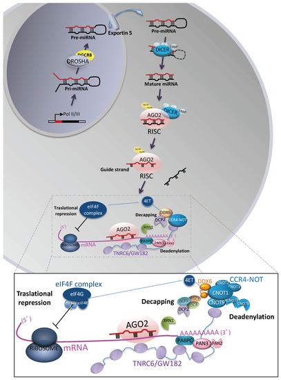 Canonical biogenesis and post-transcriptional gene silencing of microRNAs (miRNAs). In the nucleus, the miRNA gene is transcribed by RNA polymerase as a primary transcript (pri-miRNA), which is further processed by the Drosha complex to produce the precursor miRNA (pre-miRNA). Pre-miRNA is exported to the cytoplasm by exportin-5, where it is cleaved by the Dicer/TRBP complex to produce the double-stranded mature miRNA. Mature miRNA is loaded into argonaute 2 (AGO2) with the assistance of Dicer/TRBP and other proteins that form the RNA-induced silencing complex (RISC). On RISC, one miRNA strand is retained (guide strand) and the other is expulsed. miRNA binds to its target mRNA by base pairing to a partially complementary binding domain and induces gene silencing by mRNA decay and translational repression. mRNA decay involves the deadenylation and decapping of the target mRNA, followed by degradation by exoribonuclease XRN1. Deadenylation is catalyzed by PABPC and the deadenylase complexes PAN2–PAN3 and CCR4–NOT, whereas decapping is carried out by the decapping protein 2 (DCP2) with the assistance of factors DCP1, EDC3, EDC4, and DDX6. Translational repression occurs when the DDX6 interacts with 4E-transporter (4E-T), which is required for the assembly of the eukaryotic initiation factor 4F (eIF4F) complex. TRBP: transactivation response RNA binding protein; PABPC: cytoplasmic poly(A)-binding protein; EDC3 and EDC4: enhancer of decapping 3 and 4; DDX6: DEAD box protein 6.