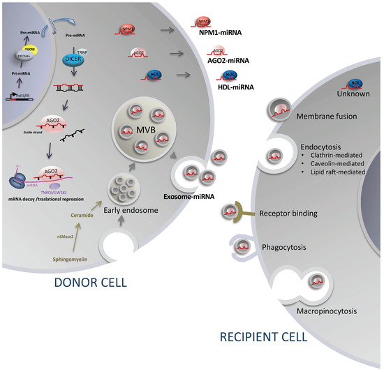 In accordance with the notion of extracellular miRNAs as mediators of intercellular communication, it was found that miRNAs exported via exosomes [11,12,93,94] and HDL [91,95] are delivered into recipient cells in a functional way. To date, there is no evidence of AGO2–miRNA complexes or NPM1-bound miRNAs being delivered into recipient cells.