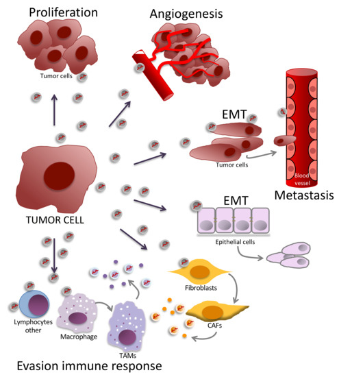 Extracellular miRNAs as intercellular mediators in cancer. In the tumor microenvironment, tumor cells release miRNAs into the extracellular space within exosomes which are delivered into other tumor cells or normal cells (resident and infiltrated cells), regulating biological processes related to cancer development and progression such as cellular proliferation, epithelial–mesenchymal transition (EMT), angiogenesis, metastasis, and the evasion of immune response. In addition to tumor cells, other cells, such as cancer-associated fibroblasts (CAFs) and tumor-associated macrophages (TAMs), release miRNAs as a mechanism of cancer regulation in addition to other soluble regulators such as cytokines as a mechanism of cancer regulation.