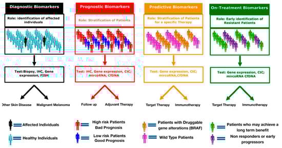 A biomarker can be anything from a serum protein, detectable genetic alteration, pathology finding, or imaging finding that helps to predict the presence of disease or guide its therapeutic options. The use of biomarkers has tremendously improved predictivity of response to treatment of some specific melanoma subtypes. Indeed, genetic testing looking for BRAF mutations, has a proven role in the choice of targeted therapy. However, the identification of definitive clinically useful biomarkers for the response to ICIs of melanoma patients is still under investigation. There is no blood test that can be used for diagnosis to detect melanoma recurrence, although lactate dehydrogenase (LDH) and S-100B can be useful for monitoring.