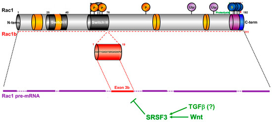 In mammals, the RAC1 gene can give rise to an alternatively spliced isoform, termed RAC1B (Figure 1). RAC1B has a more restricted tissue distribution and is expressed in a cell type- and differentiation-dependent (and presumably also disease-associated) context. The RAC1B protein is also abundantly expressed in chronic pancreatitis [9] and in human inflammatory colonic mucosa [10], and its upregulation in intestinal epithelial cells of transgenic mice contributes to intestinal wound healing after acute inflammation [11]. RAC1B mRNA or protein has also been detected in various human cancers, including those of the breast, thyroid, ovary, colon, pancreas, and lung [3]. Furthermore, among panels of established adenocarcinoma cell lines of pancreatic, lung, and breast origin, RAC1B protein expression was found to be associated with a differentiated, epithelial histomorphologic phenotype [12,13] or—according to another classification—a partial EMT phenotype [14]. In contrast, its protein and transcript levels were low or absent in (quasi)mesenchymal or basal-like cell lines [12,13] predicted to have a complete EMT phenotype [14]. The generation of the RAC1B variant is the result of the inclusion of an additional exon (exon 3b) of RAC1, which leads to a 19-amino acid in-frame insertion immediately C-terminal to the switch II domain (Figure 1). The ratio of RAC1 to RAC1B is regulated by splicing factors such as SRSF3 (formerly SRp20) and SRSF1 (formerly ASF1/SF2) that promote either the skipping or the inclusion, respectively, of exon 3b [15,16]. For instance, the Wnt pathway favors the excision of exon 3b via the induction of SRSF3 [15] (Figure 1), whereas epidermal growth factor receptor (EGFR) favors its inclusion by activation of SRSF1 [16].