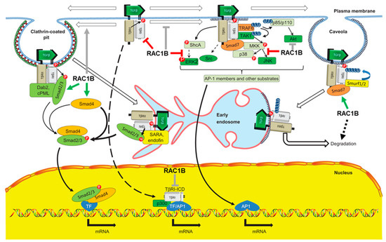 It is well documented that a portion of both RAC1 [105] and RAC1B [23] is localized to the nucleus; however, very little is known regarding the function and biological significance of nuclear RAC1 or RAC1B. In the nucleus, both isoforms can interact with a very different set of proteins and may, therefore, display novel functional activities. For instance, nuclear RAC1 has been shown to promote cell division [106] and its nucleocytoplasmic shuttling drives nuclear shape changes and tumor invasion [107]. Since TGFβ is a master regulator of both processes, assuming an interaction of RAC1 or RAC1B with Smad transcriptional complexes, or the intracellular domain of ALK5 (TβRI-ICD) that can act as a transcription factor to activate the SNAI1 and MMP2 genes [108] (Figure 2), in the nucleus is not too far-fetched. Downregulation of ALK5 by RAC1B will likely also decrease the availability of TβR1-ICD and consequently reduce its DNA-binding activity, consistent with the inhibitory effect of RAC1B on SNAI1 and MMP2 expression [74].