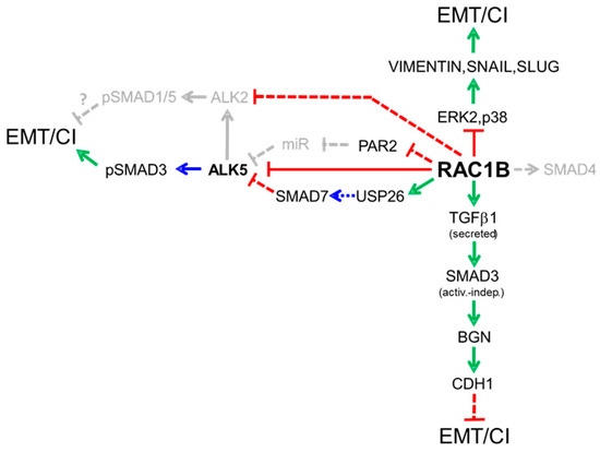 Diagram summarizing our previous findings on the regulatory interactions of RAC1B with TGFβ signaling mediators and MAPKs that in a TGFβ-dependent or independent manner inhibit epithelial–mesenchymal transition (EMT) or cell invasion (CI) in pancreatic epithelial cells. Green arrows denote stimulation of expression, blue arrows stimulatory post-translational modifications and red lines inhibition of expression. Stippled lines indicate the possible involvement of intermediary factors. Pathways in gray color are either hypothetical or have not yet been published.
