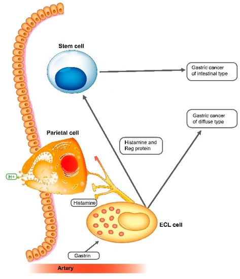 - Waldum, H.L.; Sordal, O.F.; Mjones, P.G. The Enterochromaffin-like [ECL] Cell-Central in Gastric Physiology and Pathology. Int. J. Mol. Sci. 2019, 20, 2444. [Google Scholar] [CrossRef]