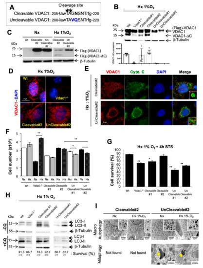 Characterization of cleavable and uncleavable clones of Voltage-dependent anion channel 1 (VDAC1) in normoxia and hypoxia. (A) Schematic representation of mutations made at the cleavage site of VDAC1. (B) Wt, Vdac1−/−, Cleavable#1/#2 and UnCleavable#1/#2 cells were incubated in Hx 1% O2 for 72 h and cell lysates were analyzed by immunoblotting for VDAC1. β-tubulin was used as a loading control. Bottom panel showed quantification of VDAC1-∆C presence in at least four different immunoblots. (C) Vdac1−/−, Cleavable #2 and UnCleavable #2 cells were incubated in Hx 1% O2 for 72 h and cell lysates were analyzed by immunoblotting for Flag (mouse monoclonal antibody). β-tubulin was used as a loading control. (D) Immunofluorescence of VDAC1 in Wt, Vdac1−/−, Cleavable#2 and UnCleavable#2 cells in Hx 1% O2 for 72 h. (E) Immunofluorescence to VDAC1 and cytochrome c (Cyto.C) in Cleavable#2 and UnCleavable#2 cells in Hx 1% O2 for 72 h. (F) Cell lines were seeded at the same density and incubated in Nx or Hx 1% O2 for 72 h. The mean ± SEM is representative of four independent experiments carried out in duplicate. (G) Wt, Vdac1−/−, Cleavable#1/#2 and UnCleavable#1/#2 cells were incubated in Hx 1% O2 for 72 h and challenged with staurosporin (STS) (1 µM) for 4 h. Cell mortality was measured using an ADAM cell counter. (H) Wt, Vdac1−/−, Cleavable#1/#2 and UnCleavable#1/#2 cells were incubated in Hx 1% O2 for 72 h in the presence of chloroquine (CQ) and cell lysates were analyzed by immunoblotting for LC3-I/II. β-tubulin was used as a loading control. Cell viability was measured using an ADAM cell counter. The mean ± SEM is representative of three independent experiments carried out in duplicate. (I) Representative electron micrographs of mitochondria from Cleavable#2 and UnCleavable#2 cells incubated in normoxia (Nx) or Hx 1% O2 for 72 h. Yellow arrows show mitochondria engulfed in autophagosomes/autolysosomes. A * p < 0.05 and ** p < 0.005 show significant differences. The uncropped Western Blot figures in Figure S10.